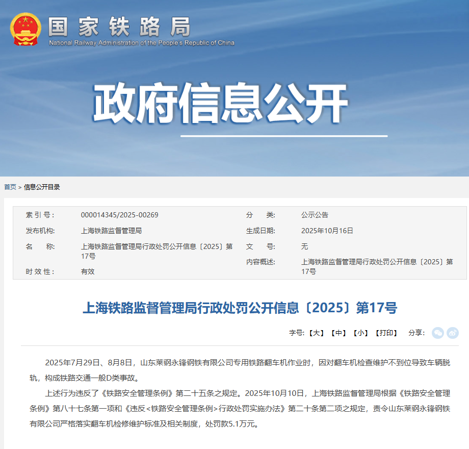 上述行为违反了《铁路安全管理条例》第二十五条之规定。2025年10月10日,上海铁路监督管理局根据《铁路安全管理条例》第八十七条第一项和《违反<铁路安全管理条例>行政处罚实施办法》第二十条第二项之规定,责令山东莱钢永锋钢铁有限公司严格落实翻车机检修维护标准及相关制度,处罚款5.1万元。
