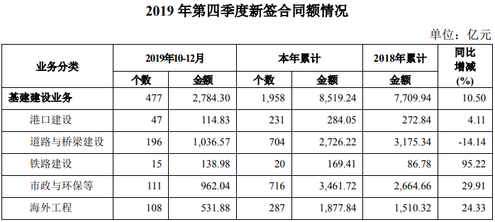 2月29日,中国交建披露2019年第四季度主要经营数据公告,公告显示,中国交建2019年新签合同金额为9626.83亿元,同比增长8.06%。(注:中国交建2018年年报显示,2019年计划新签合同额同比增长不低于8%,现在看来是严格按照计划执行的)。