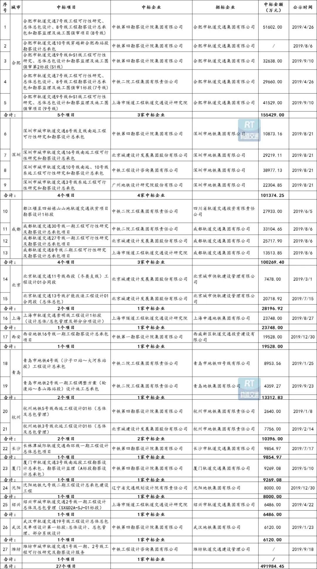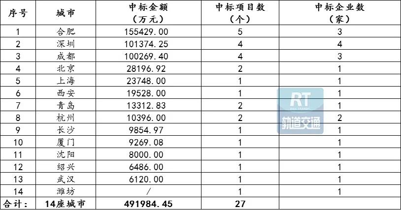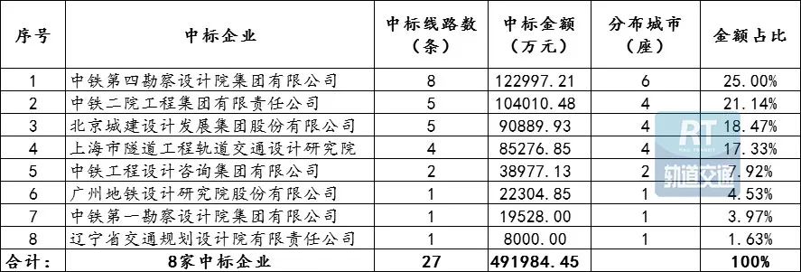 (说明:合肥市轨道交通10号线穿越新合肥西站段,潍坊市城市轨道交通1号线一期、2号线工程勘察设计,这两个项目的中标金额未查询到公开数据,因此,以上所有统计中涉及金额的部分均未统计在内。)