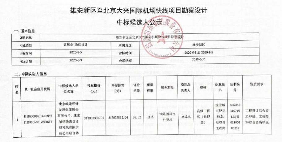 中标人:北京城建设计发展集团股份有限公司、北京城建勘测设计研究院有限责任公司联合体