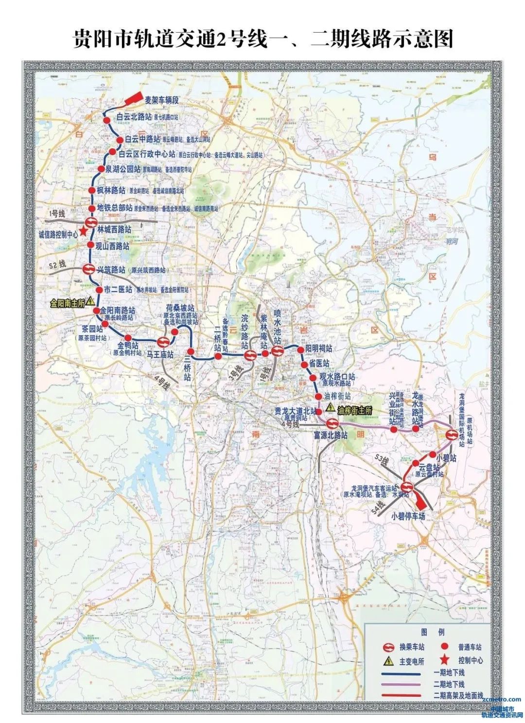 这就是贵阳地铁2号线。贵阳地铁2号线,起于沈官站,止于龙洞堡汽车客运站,大致呈现西北向东南走向,全长43.8公里,沿途共设34座车站。分别为沈官站、白云西站、白云北路站、白云中路站、白云区行政中心站、泉湖公园站、枫林路站、地铁总部站、林城西路站、观山西路站、兴筑路站、市二院站、金阳南路站、茶园站、金鸭站、马王庙站、荷桑坡站、三桥站、二桥站、浣纱路站、紫林庵站、喷水池站、阳明祠站、省医站、观水路口站、油榨街站、贵龙大道北站、富源北路站、兴业街站、龙水路站、龙洞堡国际机场站、小碧站、云盘站、龙洞堡汽车客运站,看看经过你家门口没?