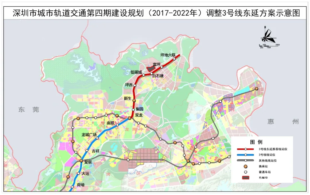 地铁3号线东延(四期工程)线路起自既有3号线双龙站,沿龙岗大道和坪西路敷设,终于坪地六联站,全长约9.28公里。建设工期为5年。