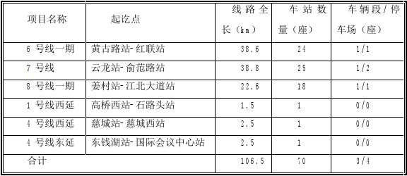 这6条线路全长106.5公里,设车站70座、车辆段3座、停车场4座、线网控制新1座、主变4座。它们各自的线路起止等信息见下表: