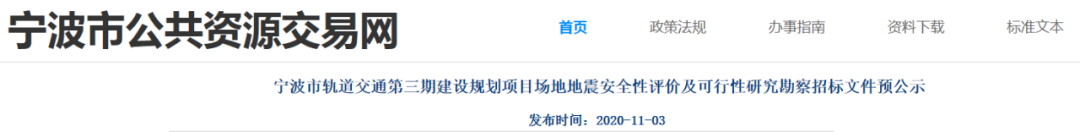 近日,宁波市公共资源交易网对“宁波市轨道交通第三期建设规划项目场地地震安全性评价及可行性研究勘察招标文件”预公示。