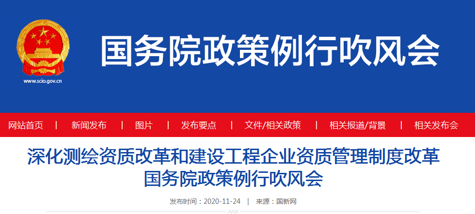 国务院新闻办公室于2020年11月24日(星期二)上午10时举行国务院政策例行吹风会,请自然资源部副部长王广华和住房城乡建设部副部长易军介绍深化测绘资质改革和建设工程企业资质管理制度改革有关情况,并答记者问。