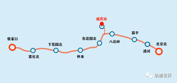 京张高铁延庆线自京张高铁八达岭西线路所引出,终点至既有延庆站,线路全长9.33公里,设计速度为160公里/小时,设延庆站1座车站。