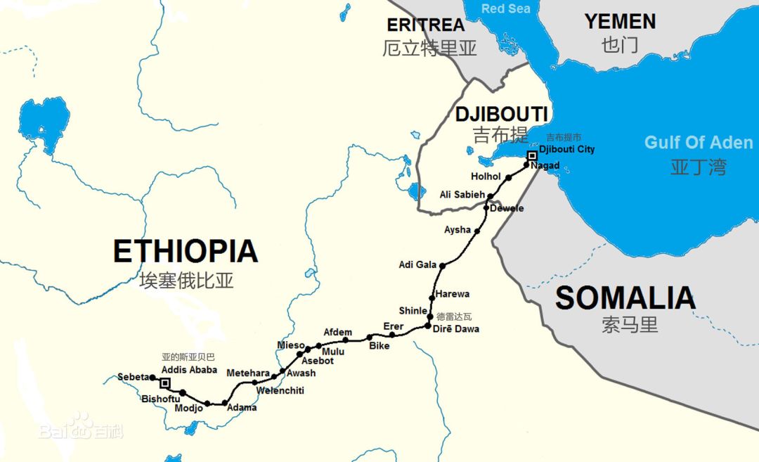 亚吉铁路西起亚的斯亚贝巴,终到东非最大现代化港口之一吉布提港的亚吉铁路,是非洲第一条全线采用中国电气化铁路标准施工的现代电气化铁路,全长752.7公里,设计时速120公里,2018年1月1日商业运营开通。
