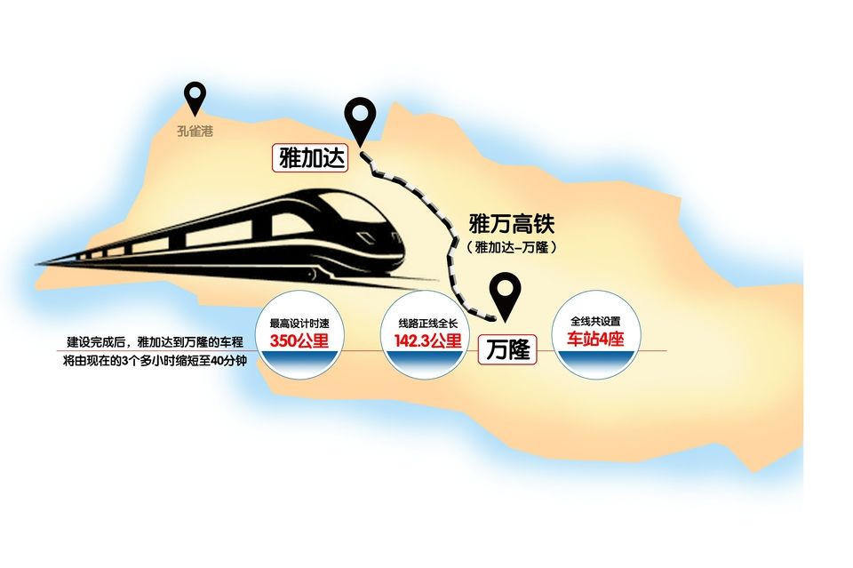 雅万高铁是印度尼西亚雅加达至万隆的高速跌路,项目全长142公里,最高设计时速350公里,是中国“一带一路”倡议和印尼海洋支点战略对接的重大项目,也是中国高铁全方位整体走出去的第一单。