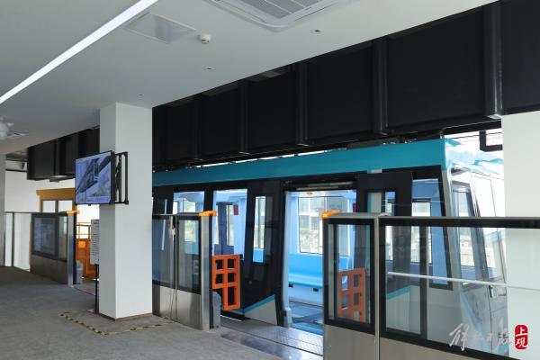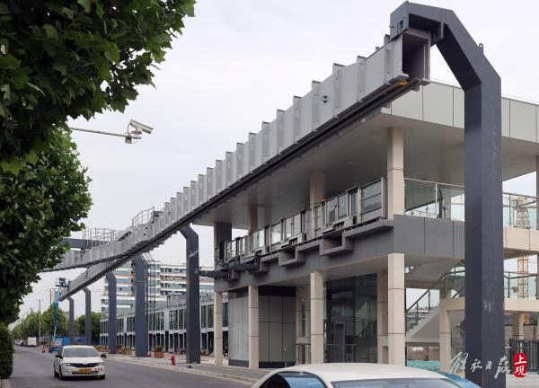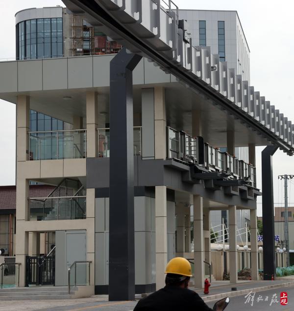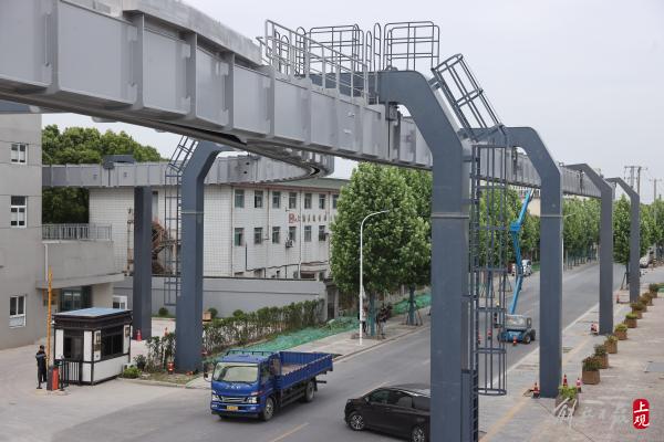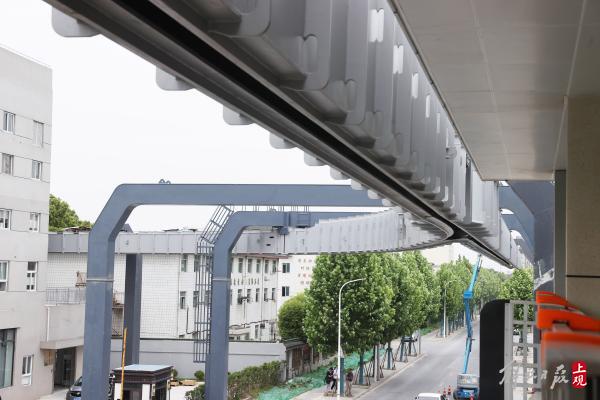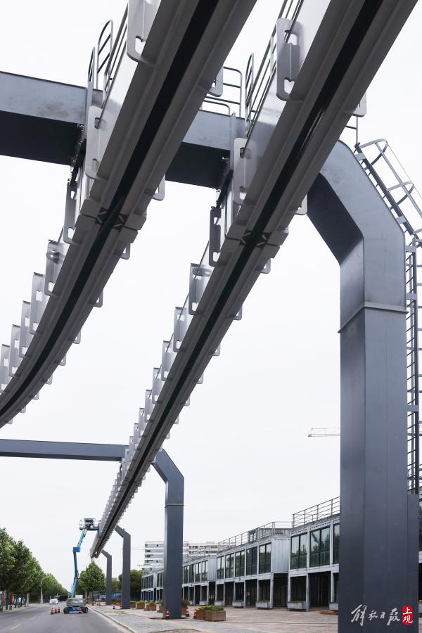 这条轨道由钢立柱支撑悬挂于空中,一端延伸至空铁示范线项目的首座车站,另一端则蜿蜒接入维修保养车间。今后,平均时速为30公里的空铁列车就将悬挂于轨道下方,穿梭于线路、站点之间。