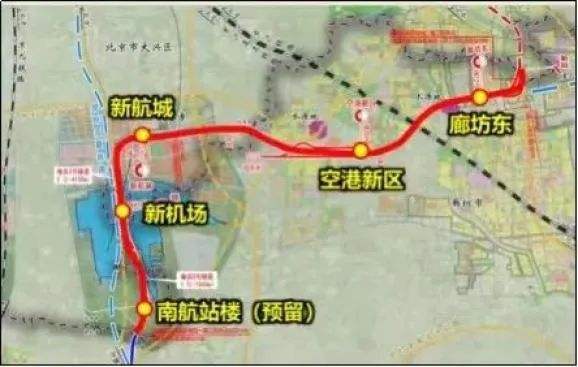 据介绍,新建城际铁路联络线是北京大兴机场“五纵二横”综合交通的主要轨道干线,起自廊坊东站以东的京冀交界处,经廊坊市广阳区、北京市大兴区,终至北京新机场以南京冀交界处,设计时速200公里,线路全长 39.339公里,共设廊坊东站、空港新区站、新航城站、新机场站4站和空港新区动车所1座。