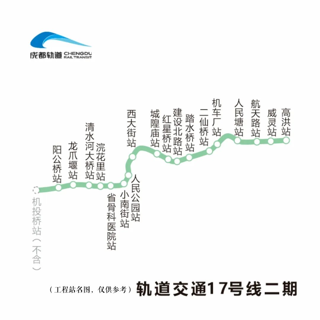 17号线二期工程全长24.8公里,西起机投桥站,东至高洪站,设站18座,设计时速140公里/小时,为全地下快线。工程建成后,将全面实现温江组团、双流组团、中心城区与成都天府国际机场之间的快速通达。